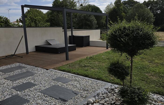 Vous profiterez d’un jardin paysagé avec deux terrasses, un terrain de pétanque et un garage attenant à la maison