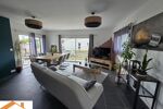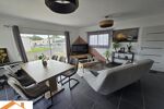 Un salon-séjour lumineux avec une cuisine moderne entièrement aménagée et équipée avec accès sur une terrasse carrelée