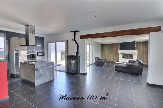 La partie principale de la maison de 110 m² se compose d’une vaste pièce de vie lumineuse avec poêle à granulés et cheminée insert, d’une cuisine aménagée et équipée avec îlot central, d’une arrière-cuisine, de 3 chambres, d’une salle d’eau, ainsi que de WC séparés avec lave-mains.
