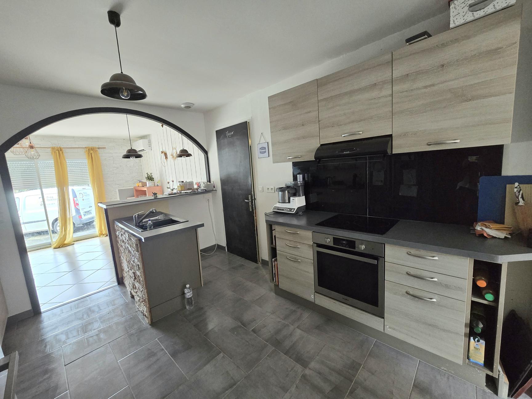 Une entrée, une pièce de vie lumineuse avec un poêle à bois, une cuisine aménagée et équipée, un salon, une salle d'eau et WC séparé,